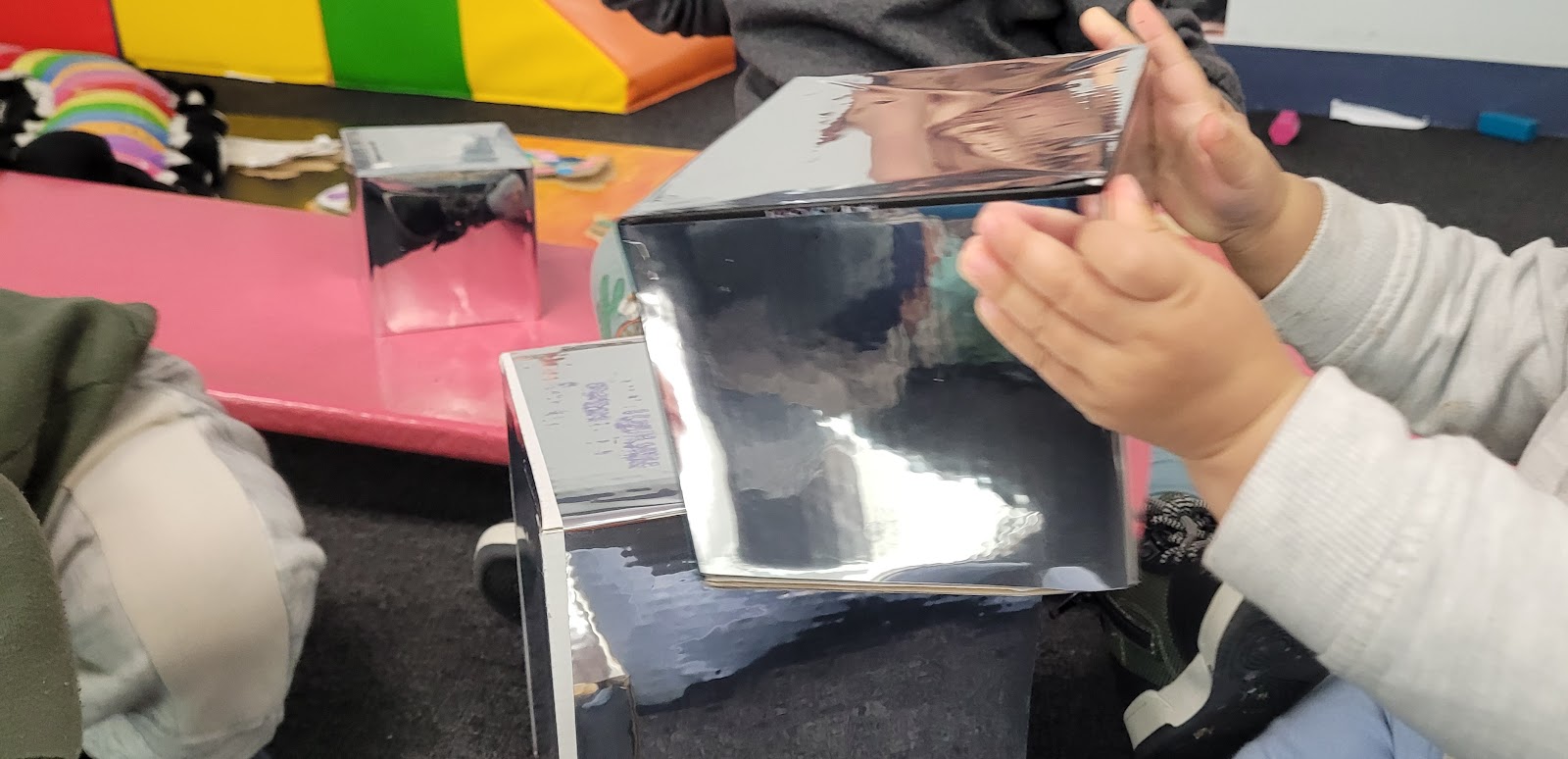 (Some babies use the mirror boxes as a stacking toy instead. This is evident that they are confident and involved learners, as they use play to investigate, imagine and explore ideas).